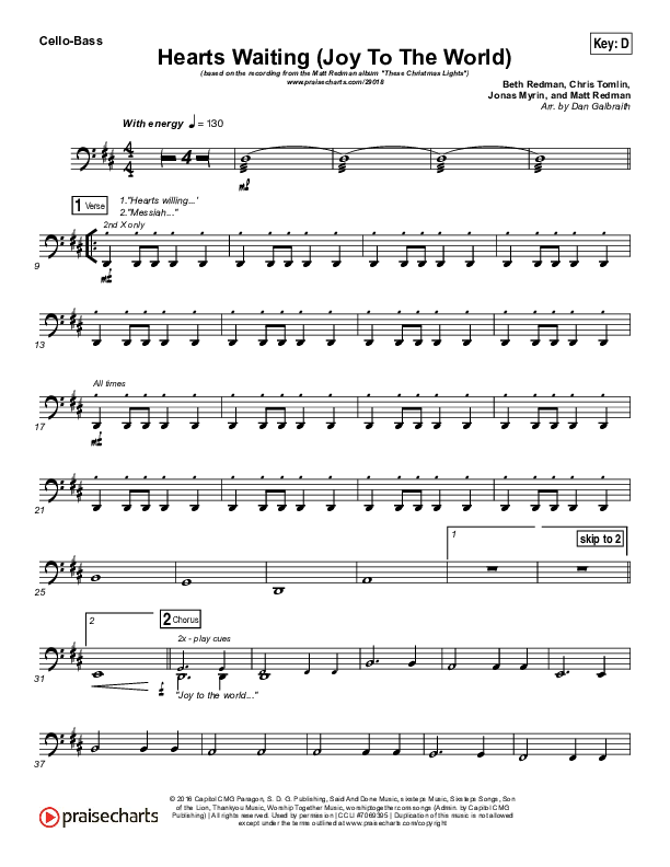 Download the Orchestration for Hearts Waiting (Joy To The World) by Matt Redman, from the album These Christmas Lights. This song was arranged by Daniel Galbraith in the key of D, E.