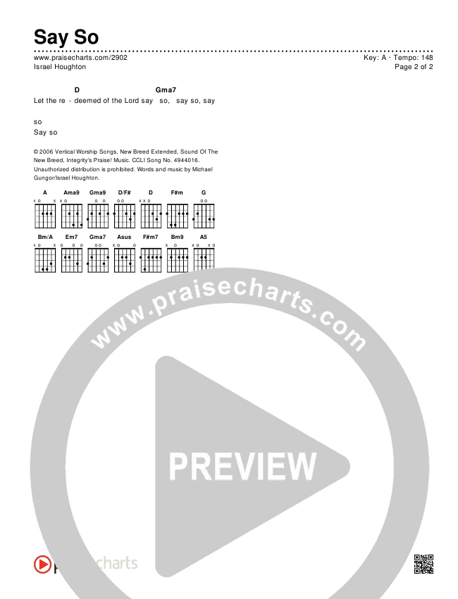 Download the PDF Chord Charts for Say So by Israel Houghton, from the album A Deeper Level. This song was arranged by Daniel Galbraith in the key of E, F.