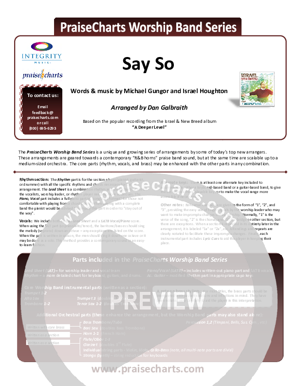Download the Orchestration for Say So by Israel Houghton, from the album A Deeper Level. This song was arranged by Daniel Galbraith in the key of E, F.