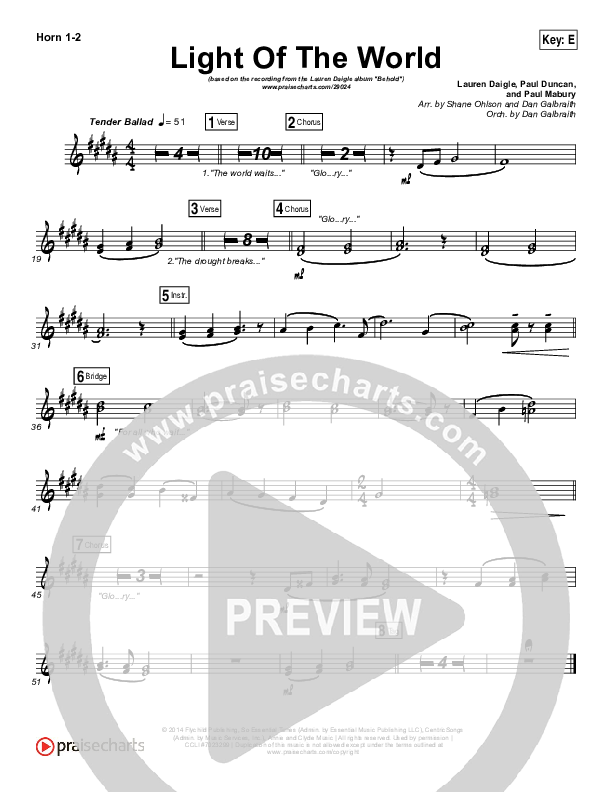 Download the French Horn sheet music for Light Of The World by Lauren Daigle, from the album Behold. This song was arranged by Shane Ohlson / Daniel Galbraith in the key of E, F.