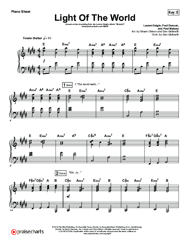 Download the Orchestration for Light Of The World by Lauren Daigle, from the album Behold. This song was arranged by Shane Ohlson / Daniel Galbraith in the key of E, F.