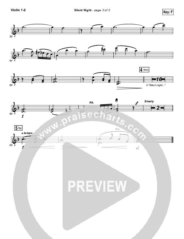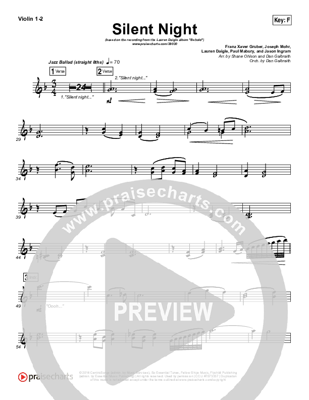 Download the Violin sheet music for Silent Night by Lauren Daigle, from the album Behold. This song was arranged by Shane Ohlson / Daniel Galbraith in the key of F, G.