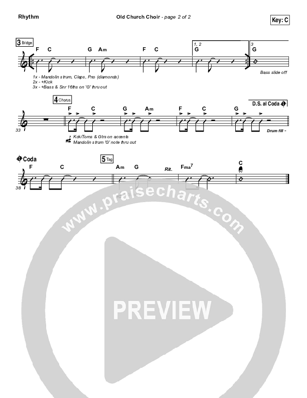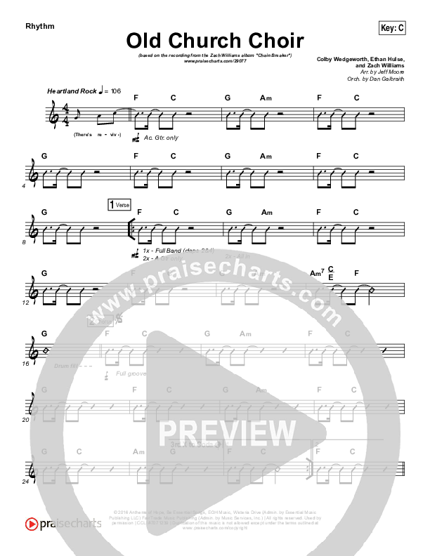 Download the Rhythm Chart for Old Church Choir by Zach Williams, from the album Chain Breaker. This song was arranged by Jeff Moore / Daniel Galbraith in the key of A, Bb, C.