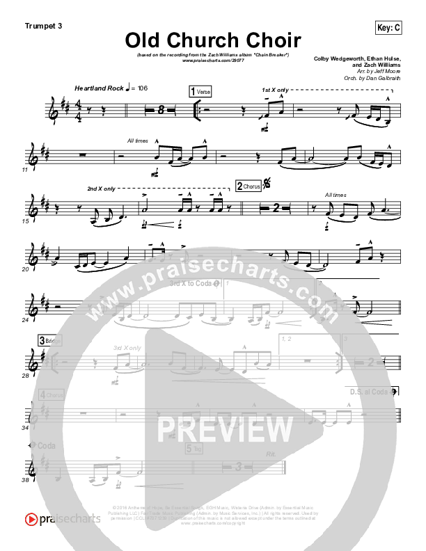Download the Trumpet 3 sheet music for Old Church Choir by Zach Williams, from the album Chain Breaker. This song was arranged by Jeff Moore / Daniel Galbraith in the key of A, Bb, C.