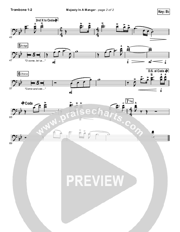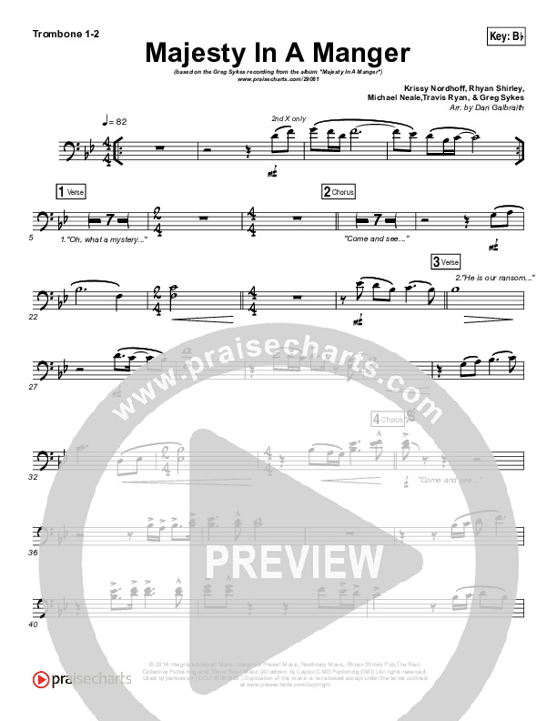 Download the Trombone 1,2 sheet music for Majesty In A Manger by Greg Sykes, from the album Majesty In A Manger. This song was arranged by Daniel Galbraith in the key of A, Bb.