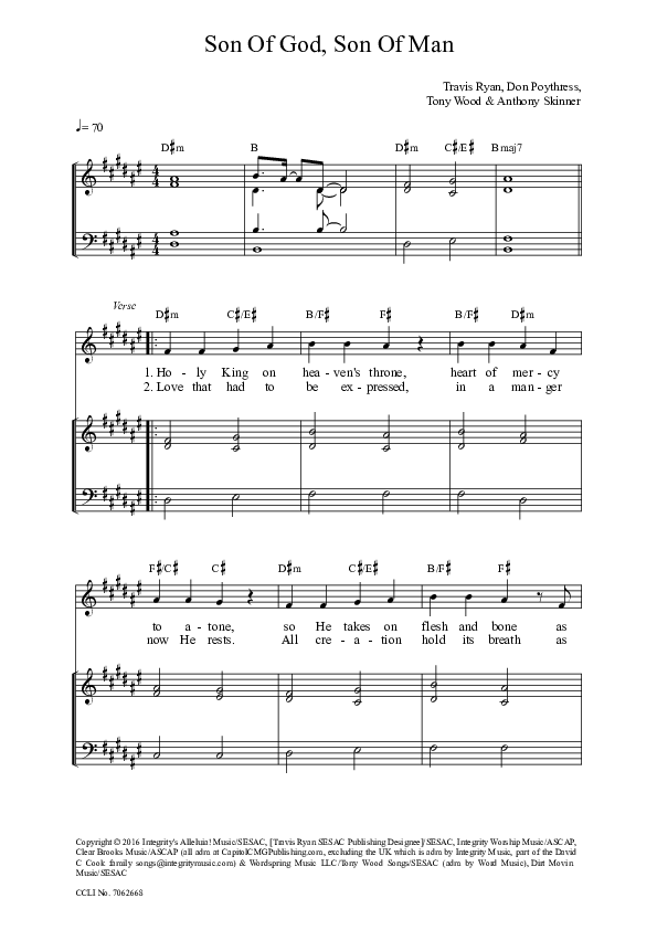 Download the sheet music for Son Of God Son Of Man by Travis Ryan, from the album Majesty In A Manger. This song was arranged by Integrity Music in the key of F#.