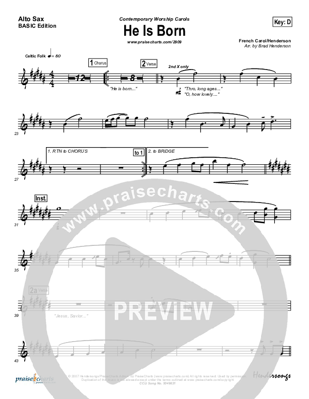 Download the AltoSax sheet music for He Is Born by Andrea Duvall, from the album Contemporary Worship Carols. This song was arranged by Brad Henderson in the key of D, Eb.