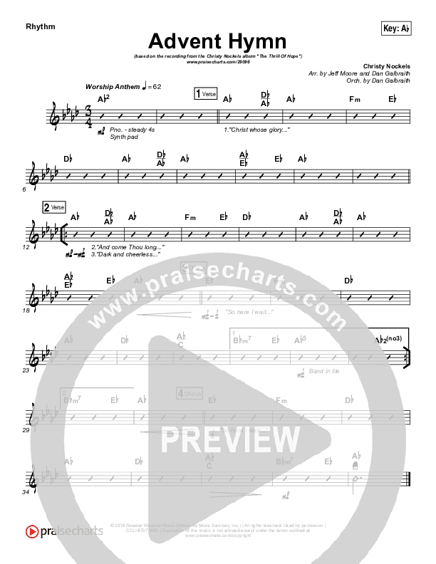 Download the Rhythm Chart for Advent Hymn by Christy Nockels, from the album The Thrill Of Hope. This song was arranged by Jeff Moore / Daniel Galbraith in the key of A, Ab.
