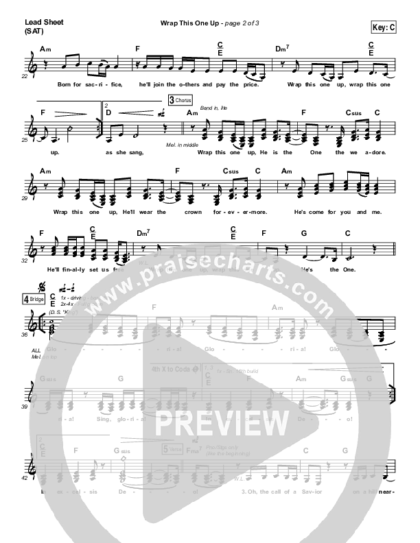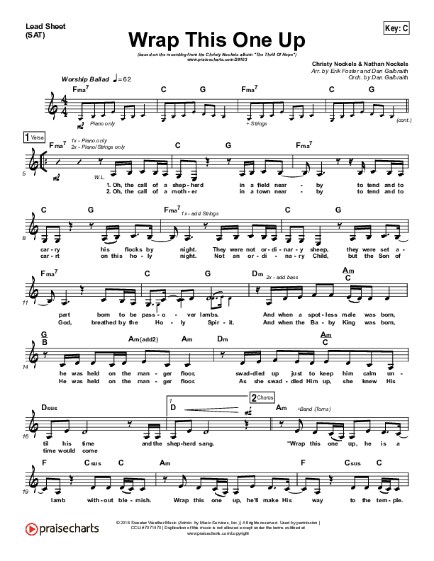 Download the sheet music for Wrap This One Up by Christy Nockels, from the album The Thrill Of Hope. This song was arranged by Erik Foster / Daniel Galbraith in the key of C, D.