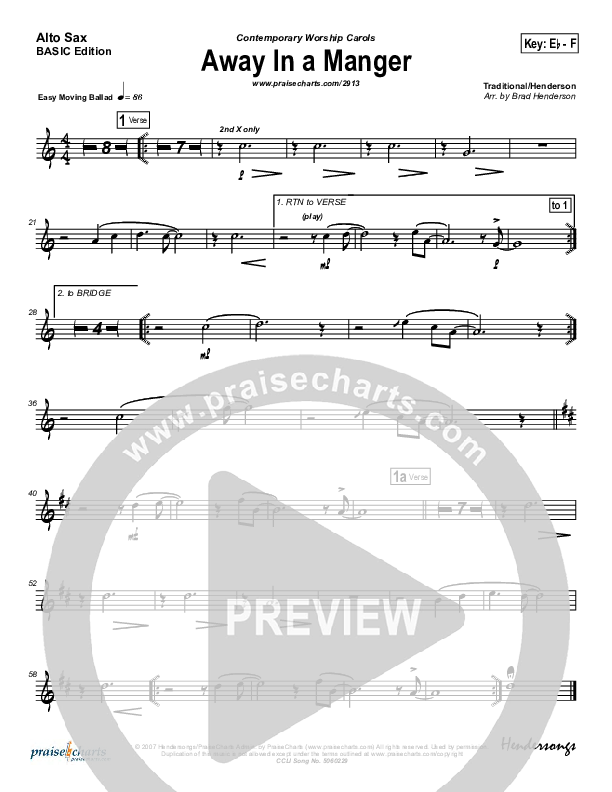 Download the AltoSax sheet music for Away In A Manger by Andrea Duvall, from the album Contemporary Worship Carols. This song was arranged by Brad Henderson in the key of D, Eb.