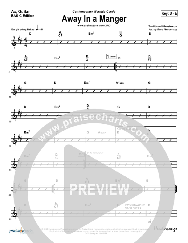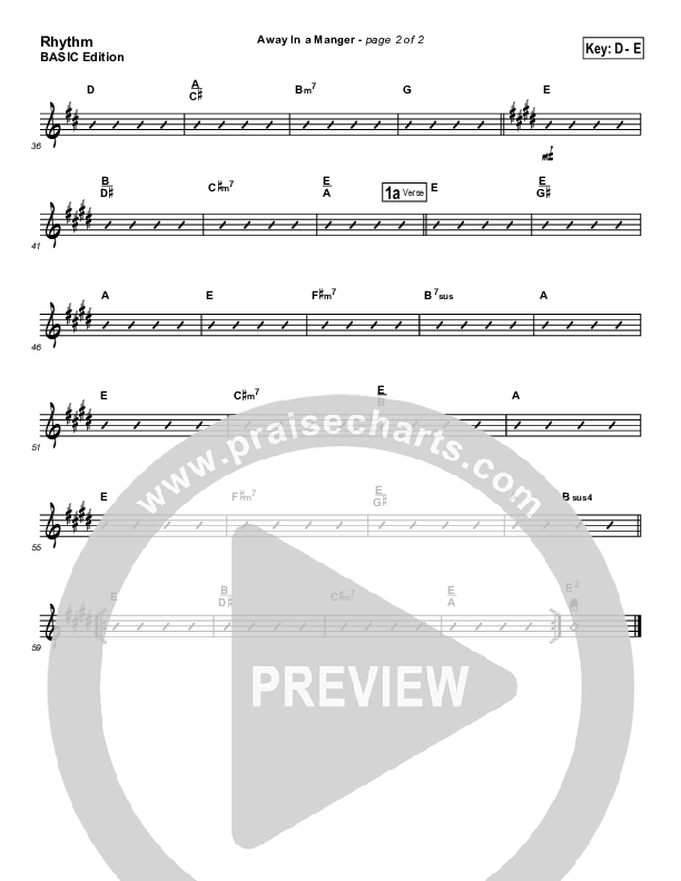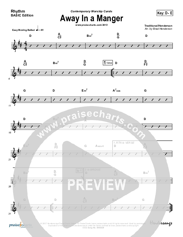 Download the Rhythm Chart for Away In A Manger by Andrea Duvall, from the album Contemporary Worship Carols. This song was arranged by Brad Henderson in the key of D, Eb.