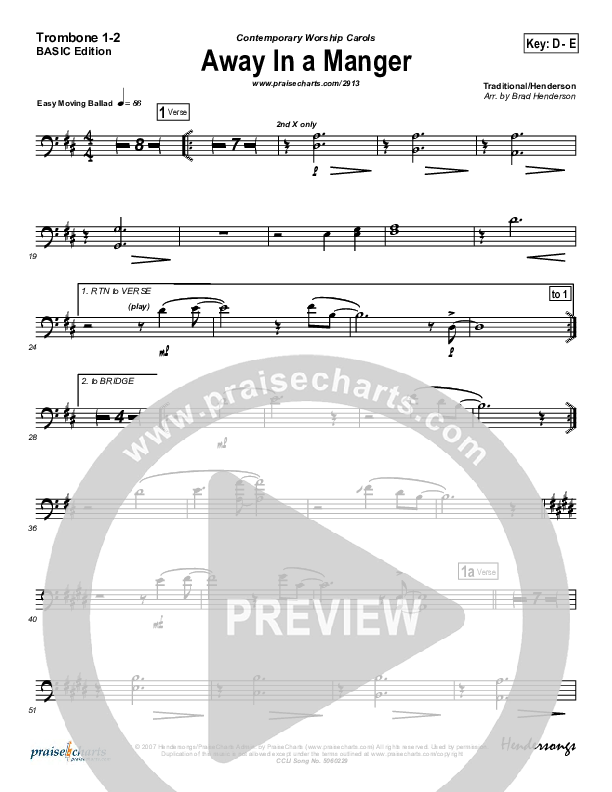 Download the Trombone 1,2 sheet music for Away In A Manger by Andrea Duvall, from the album Contemporary Worship Carols. This song was arranged by Brad Henderson in the key of D, Eb.