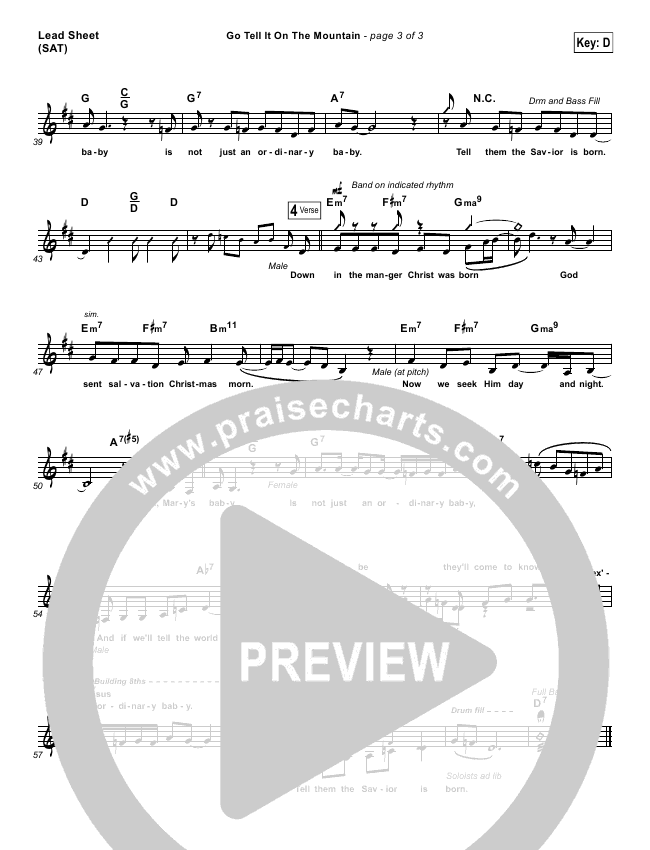 Discover popular versions of "Go Tell It On The Mountain," a Christmas classic proclaiming the joyful news of Christ's birth. These renditions add festive energy to seasonal worship. Download chord charts, lead sheets, orchestrations, and multitracks to bring this powerful message of Christ's arrival to your Christmas services.