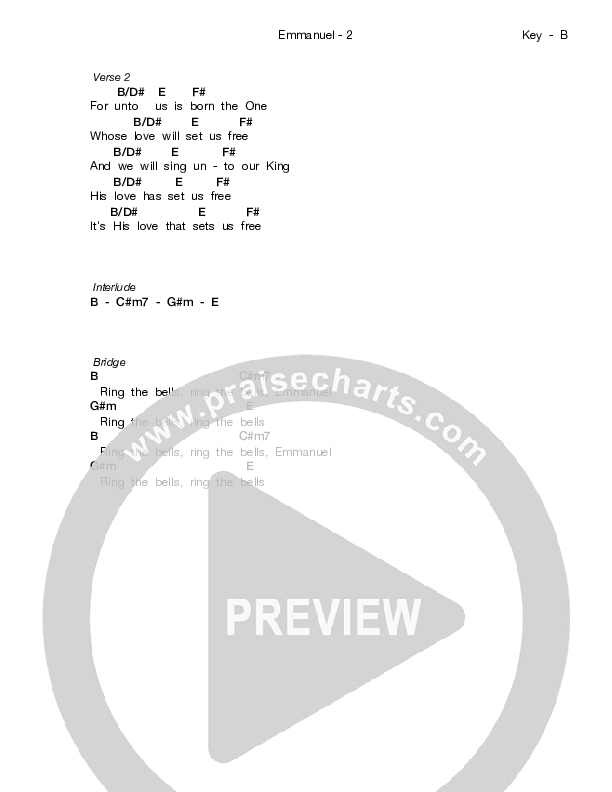 Download the PDF Chord Charts for Emmanuel by Love & The Outcome, from the album Emmanuel. This song was arranged by Dustin Loehrs in the key of B.