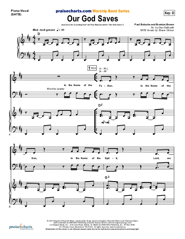 Download the sheet music for Our God Saves by Paul Baloche, from the album Our God Saves. This song was arranged by Daniel Galbraith in the key of Bb, C, D.