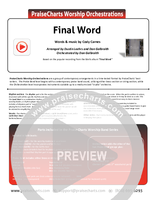 Download the Orchestration for The Cross Has The Final Word by Wells, from the album Final Word. This song was arranged by Dustin Loehrs / Daniel Galbraith in the key of Bb, C, Db.