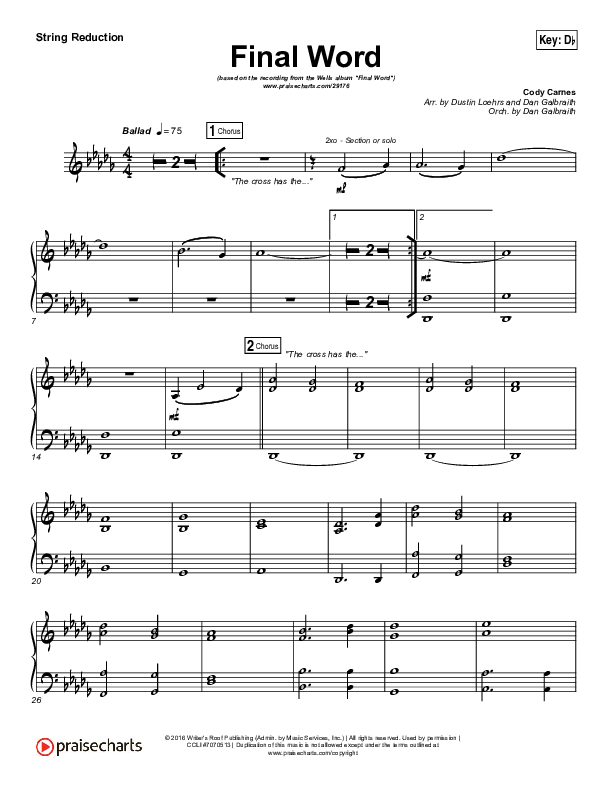 Download the Orchestration for The Cross Has The Final Word by Wells, from the album Final Word. This song was arranged by Dustin Loehrs / Daniel Galbraith in the key of Bb, C, Db.