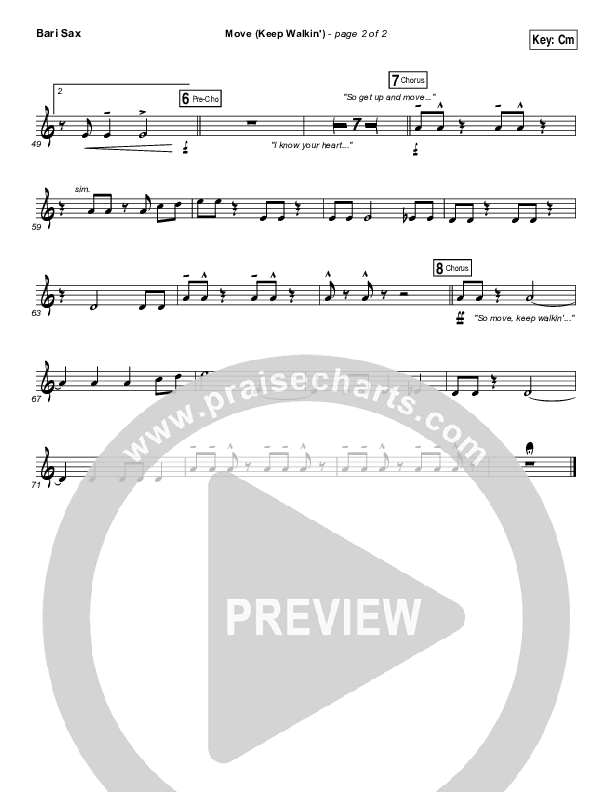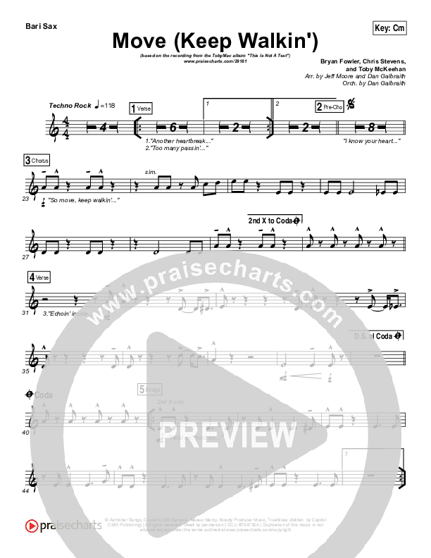 Download the Bari Sax sheet music for Move (Keep Walkin) by TobyMac, from the album This Is Not A Test. This song was arranged by Jeff Moore / Daniel Galbraith in the key of Bm, Cm.