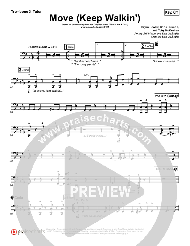 Download the Trombone 3/Tuba sheet music for Move (Keep Walkin) by TobyMac, from the album This Is Not A Test. This song was arranged by Jeff Moore / Daniel Galbraith in the key of Bm, Cm.
