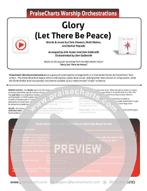 Download the Orchestration for Glory (Let There Be Peace) by Matt Maher, from the album Glory (Let There Be Peace). This song was arranged by Erik Foster / Daniel Galbraith in the key of F, Gb.