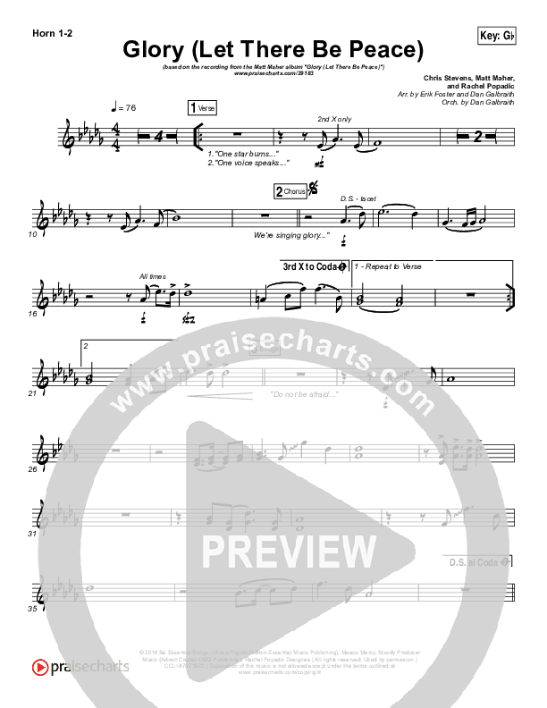 Download the French Horn sheet music for Glory (Let There Be Peace) by Matt Maher, from the album Glory (Let There Be Peace). This song was arranged by Erik Foster / Daniel Galbraith in the key of F, Gb.