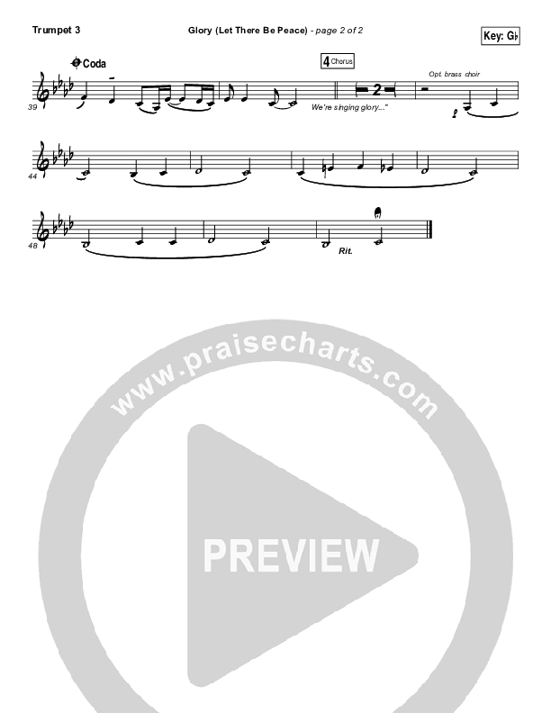 Download the Trumpet 3 sheet music for Glory (Let There Be Peace) by Matt Maher, from the album Glory (Let There Be Peace). This song was arranged by Erik Foster / Daniel Galbraith in the key of F, Gb.