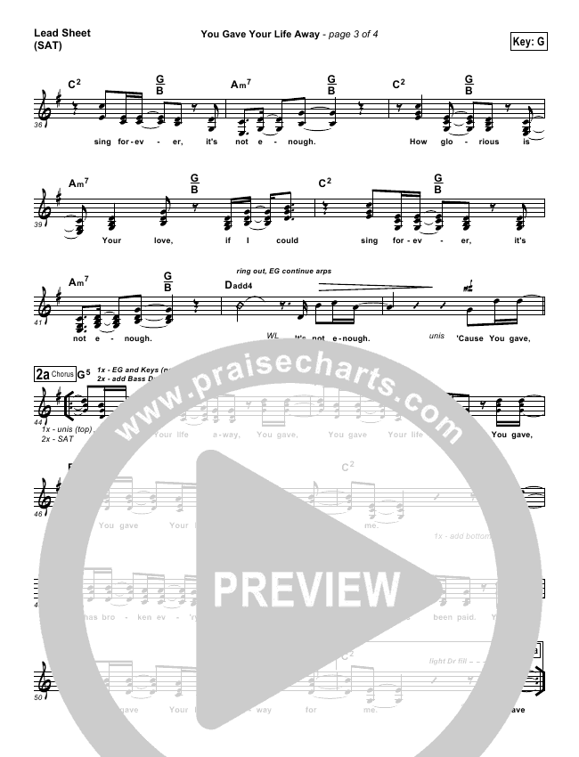 Download the Orchestration for You Gave Your Life Away by Paul Baloche, from the album Our God Saves. This song was arranged by John Wasson in the key of F, G.