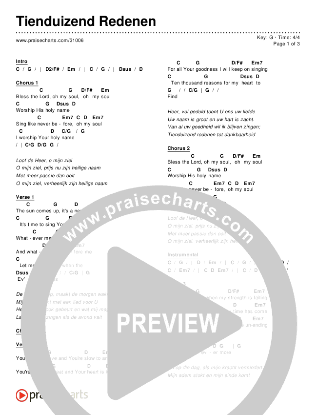 Download the PDF Chord Charts for Tienduizend Redenen (10000 Reasons (Bless The Lord)) by Matt Redman / Passion, from the album Worship Songs In Dutch.