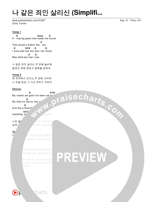 Download the PDF Chord Charts for 나 같은 죄인 살리신 (Amazing Grace (My Chains Are Gone)) (Simplified), from the album Simplified Worship Songs In Korean.