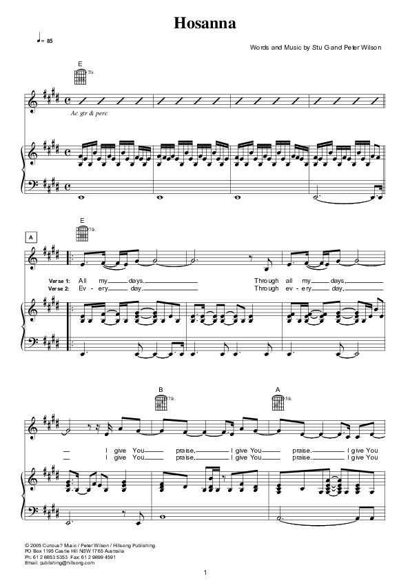Download the sheet music for Hosanna by Hillsong London / Hillsong Worship, from the album Jesus Is. This song was arranged by Hillsong Music in the key of E.