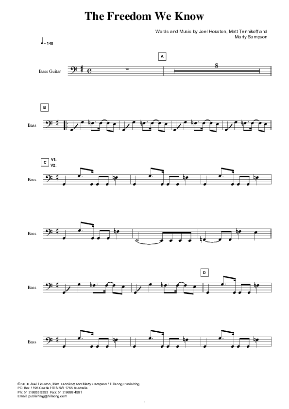 Download the Bass Guitar parts for The Freedom We Know (Instrumental) by Hillsong Worship, from the album Mighty To Save. This song was arranged by Hillsong Charts in the key of G.