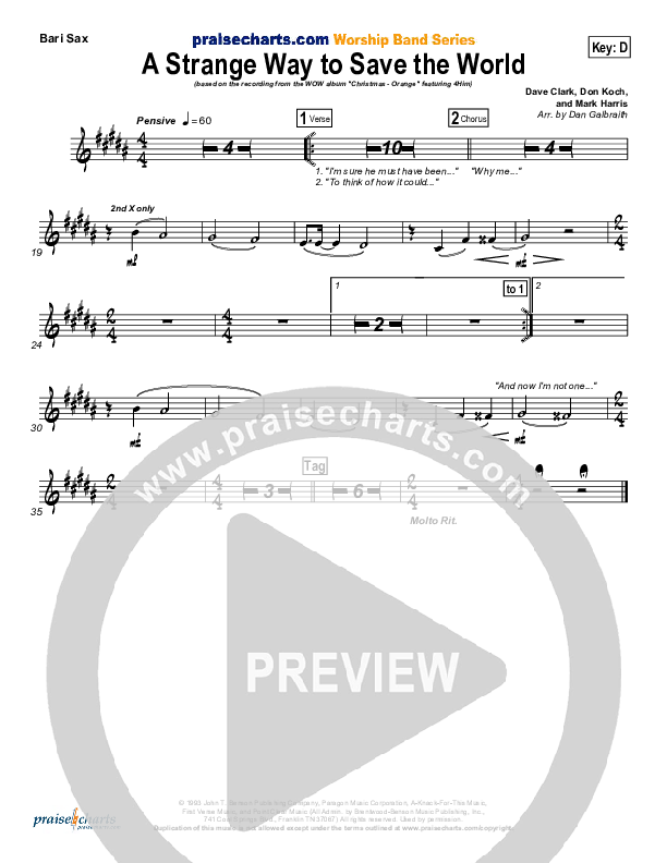 Download the Bari Sax sheet music for A Strange Way To Save The World by 4Him, from the album WOW Christmas Red. This song was arranged by Daniel Galbraith in the key of C, D.