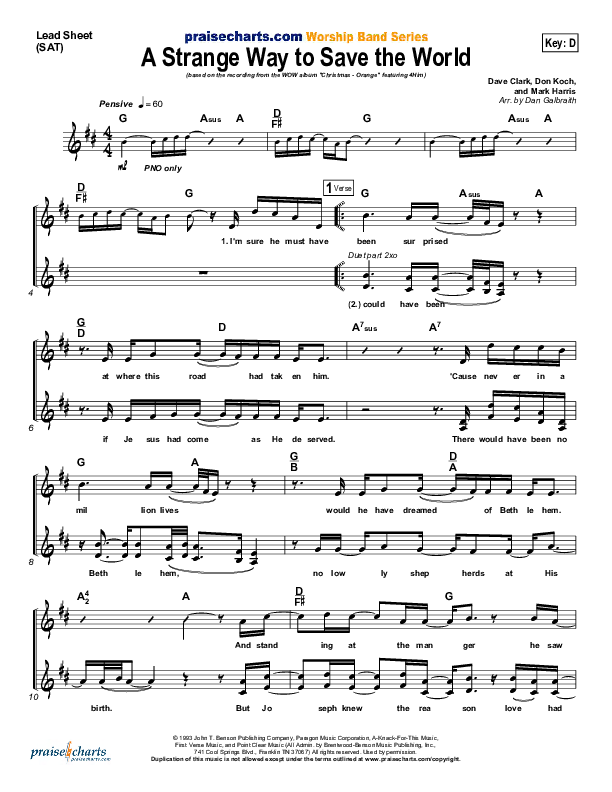 Download the Orchestration for A Strange Way To Save The World by 4Him, from the album WOW Christmas Red. This song was arranged by Daniel Galbraith in the key of C, D.