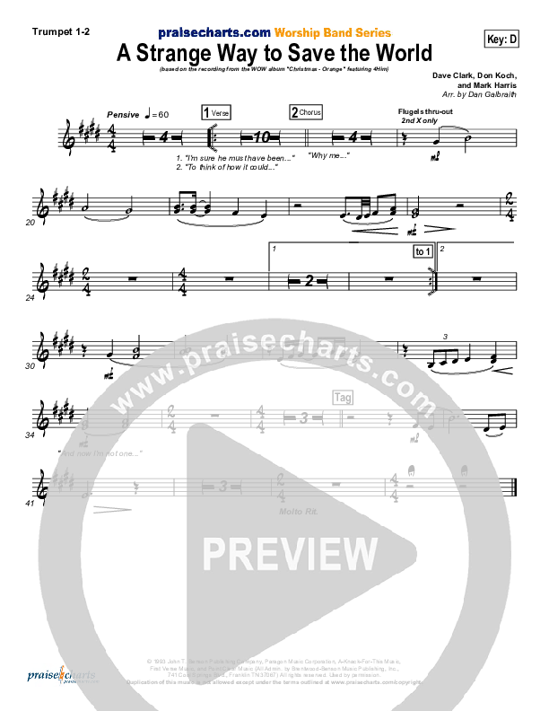 Download the trumpet sheet music for A Strange Way To Save The World by 4Him, from the album WOW Christmas Red. This song was arranged by Daniel Galbraith in the key of C, D.