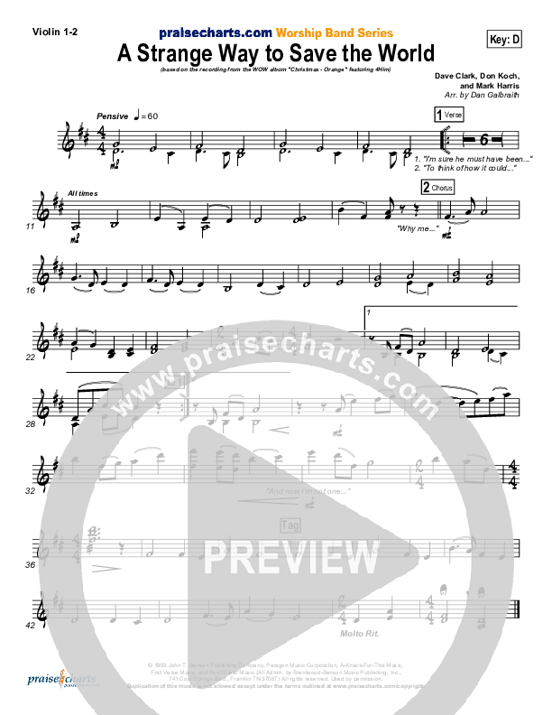 Download the Violin sheet music for A Strange Way To Save The World by 4Him, from the album WOW Christmas Red. This song was arranged by Daniel Galbraith in the key of C, D.