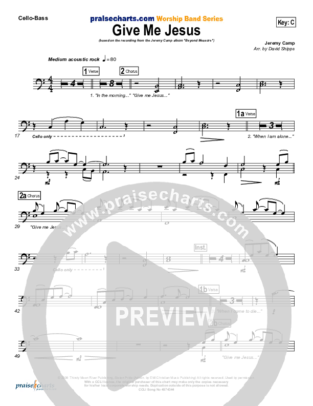 Download the Orchestration for Give Me Jesus by Jeremy Camp, from the album Beyond Measure. This song was arranged by David Shipps in the key of Bb, C.