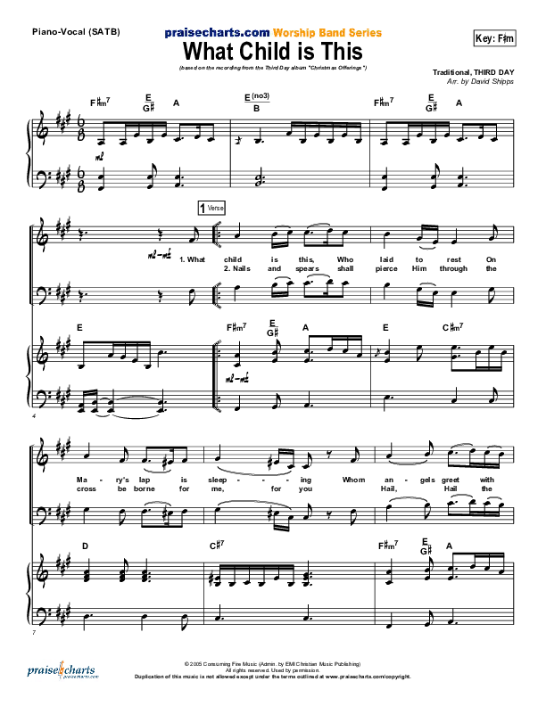 Download the sheet music for What Child Is This by Third Day, from the album Christmas Offerings. This song was arranged by David Shipps in the key of Em, F#m.