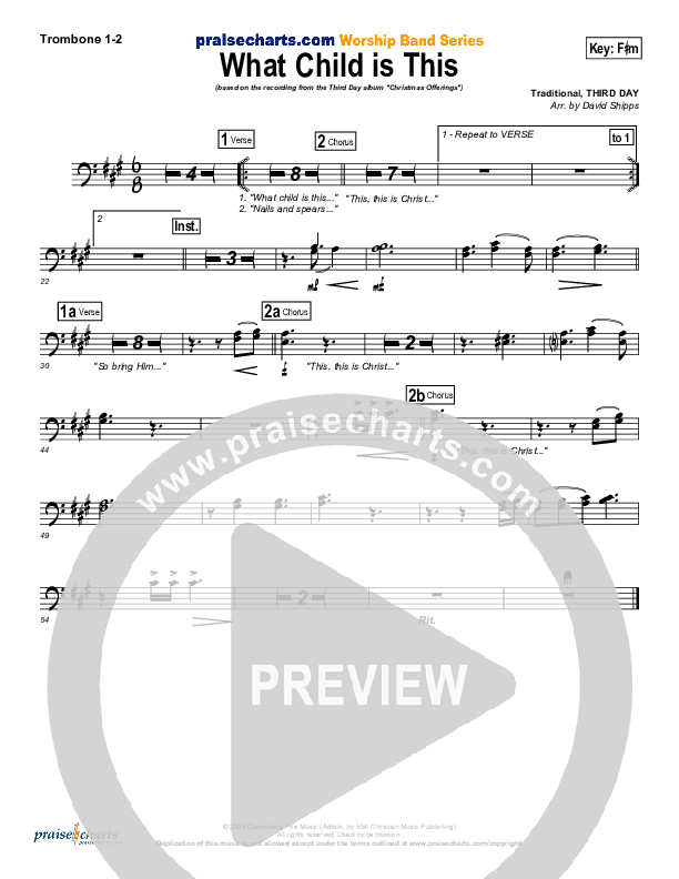 Download the Trombone 1,2 sheet music for What Child Is This by Third Day, from the album Christmas Offerings. This song was arranged by David Shipps in the key of Em, F#m.