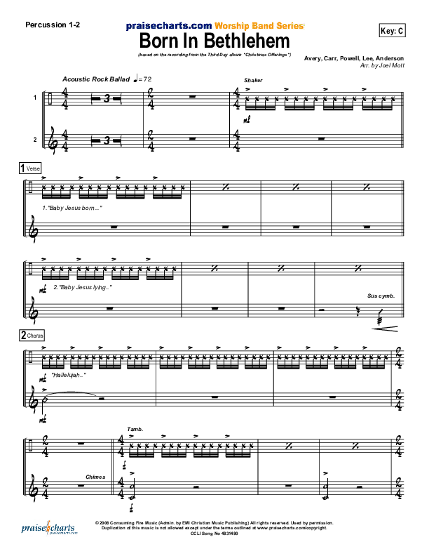 Download the percussion sheet music for Born In Bethlehem by Third Day, from the album Christmas Offerings. This song was arranged by Joel Mott in the key of C, D.