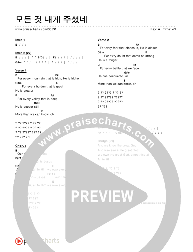 Download the PDF Chord Charts for 모든 것 내게 주셨네, from the album Worship Songs In Korean.