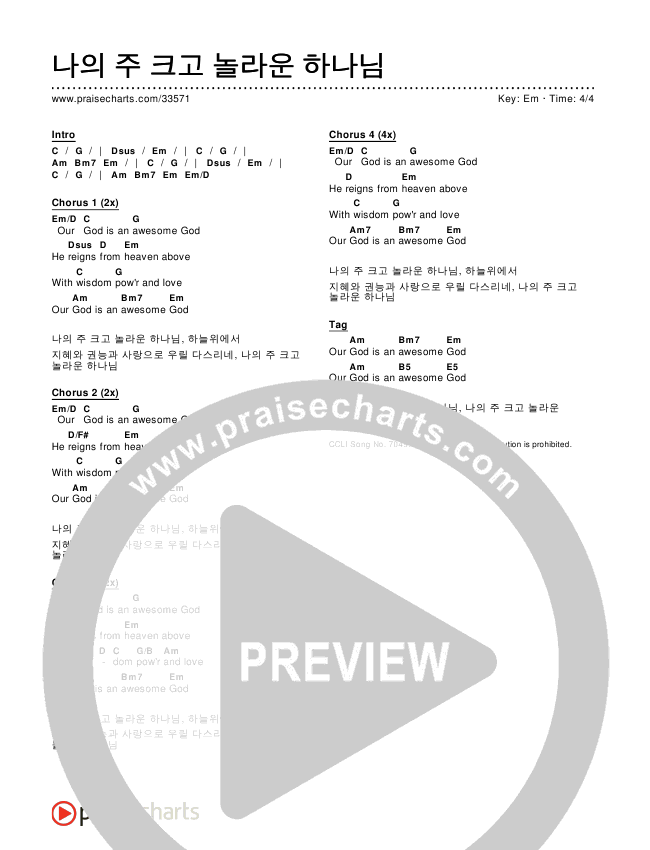 Download the PDF Chord Charts for 나의 주 크고 놀라운 하나님, from the album Worship Songs In Korean.