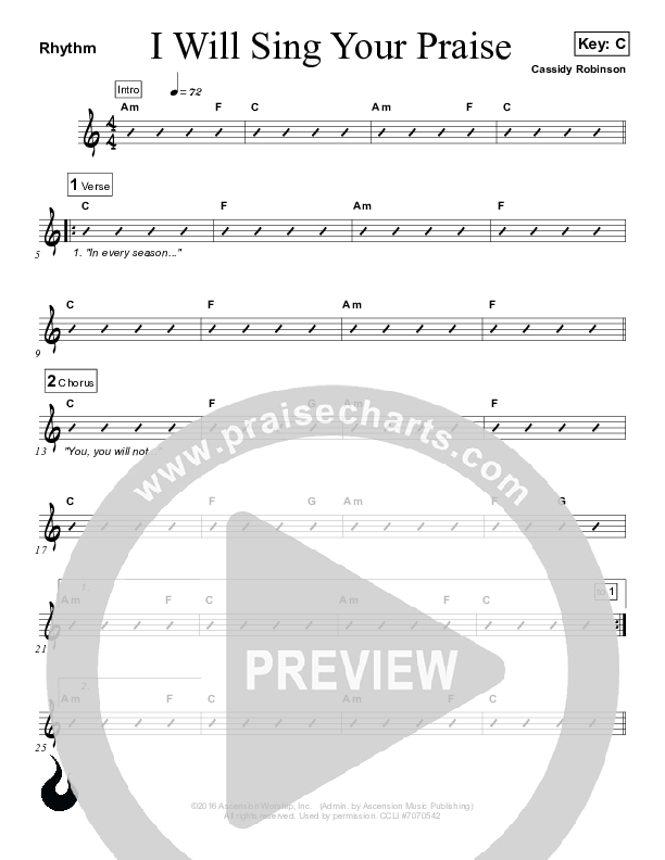 Download the Rhythm Chart for I Will Sing Your Praise by Ascension Worship, from the album Songs Of Ascension Worship. This song was arranged by Ryan Dahl in the key of C.