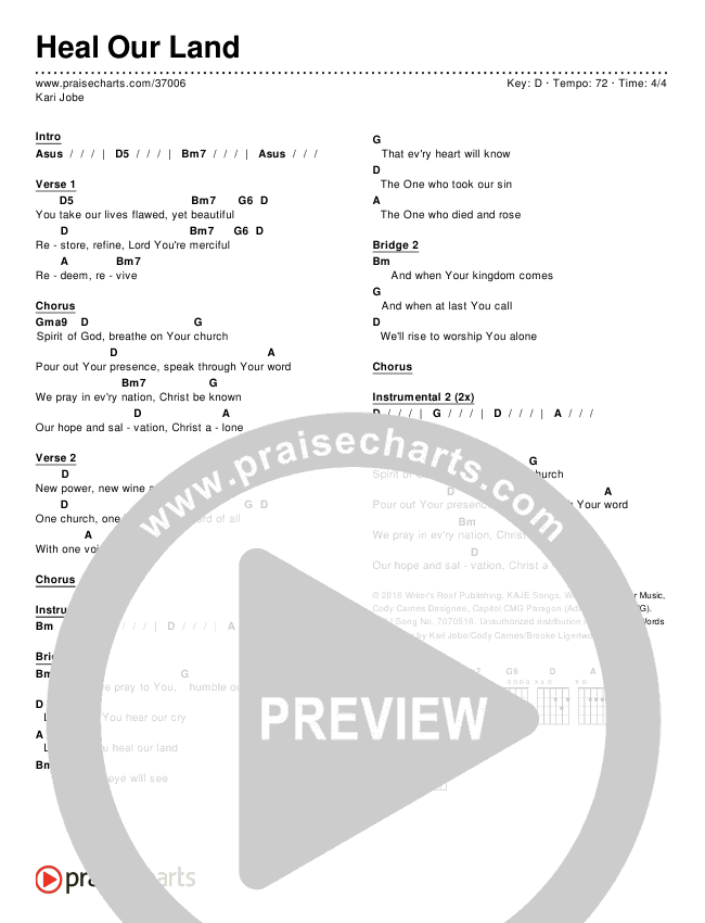 Download the PDF Chord Charts for Heal Our Land by Kari Jobe, from the album The Garden. This song was arranged by Daniel Galbraith in the key of D, Eb.