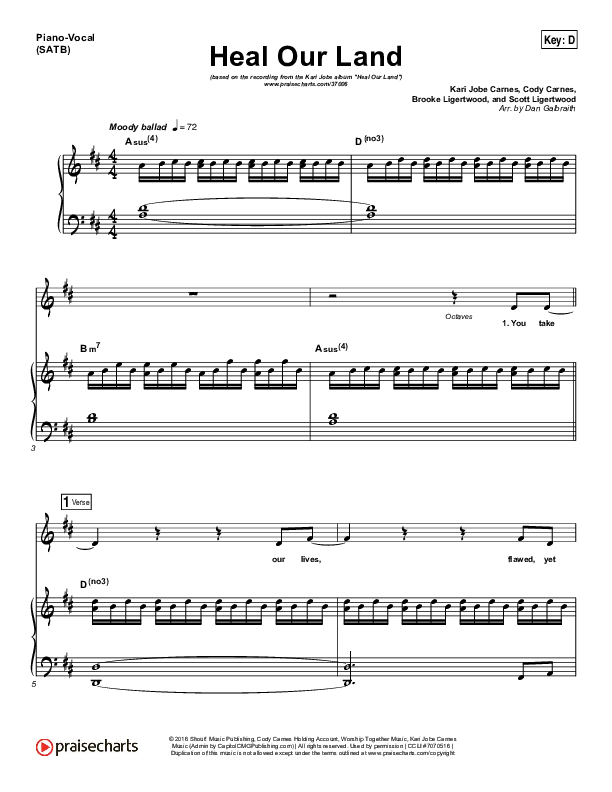 Download the sheet music for Heal Our Land by Kari Jobe, from the album The Garden. This song was arranged by Daniel Galbraith in the key of D, Eb.