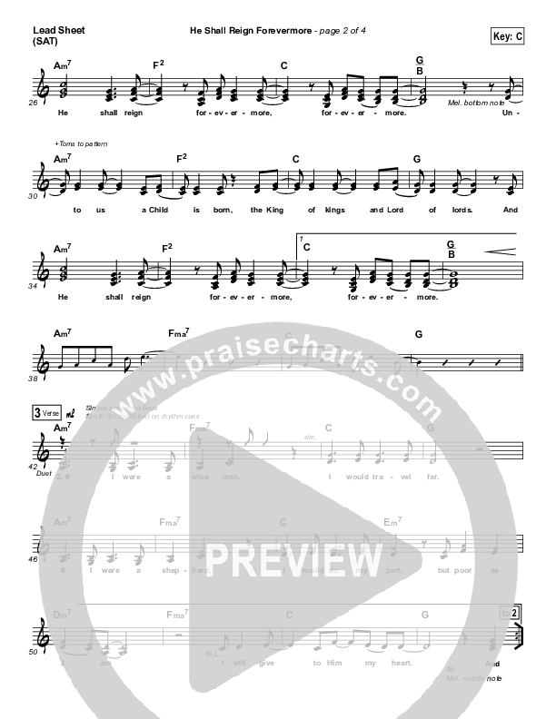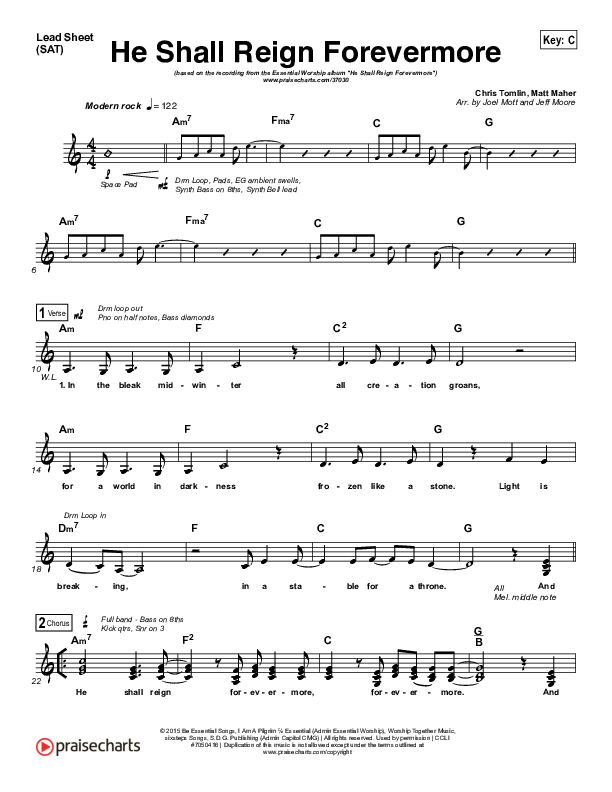 Download the sheet music for He Shall Reign Forevermore by Essential Worship, from the album He Shall Reign Forevermore. This song was arranged by Jeff Moore in the key of C, D.