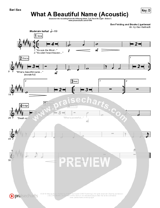 Download the Bari Sax sheet music for What A Beautiful Name (Acoustic) by Hillsong Worship, from the album Let There Be Light. This song was arranged by Daniel Galbraith in the key of D, E, Eb.