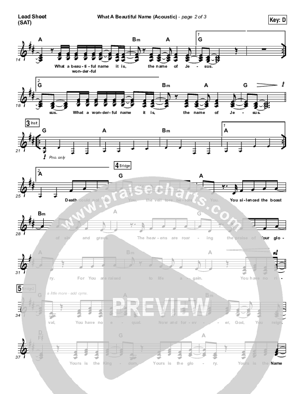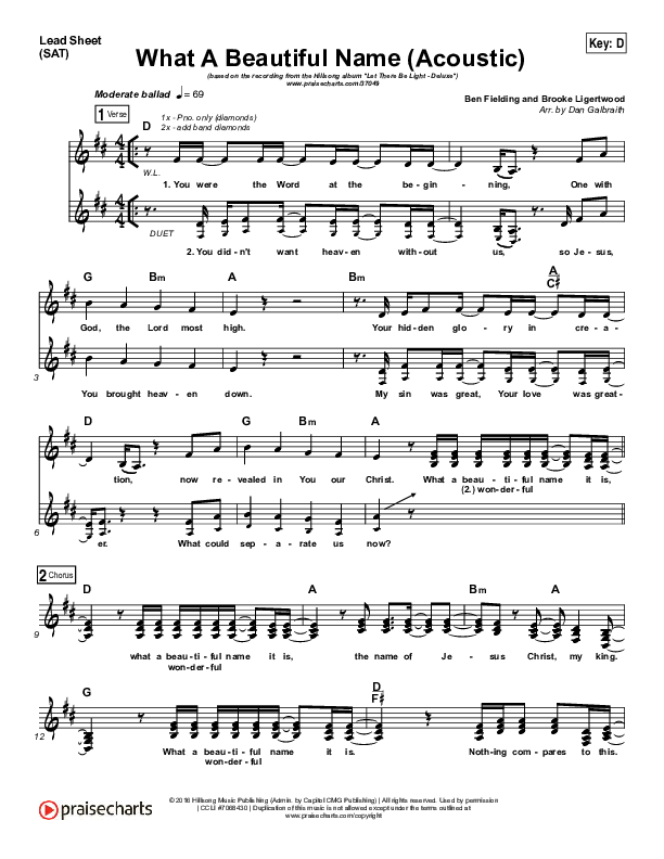 Download the sheet music for What A Beautiful Name (Acoustic) by Hillsong Worship, from the album Let There Be Light. This song was arranged by Daniel Galbraith in the key of D, E, Eb.