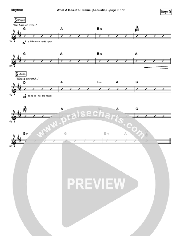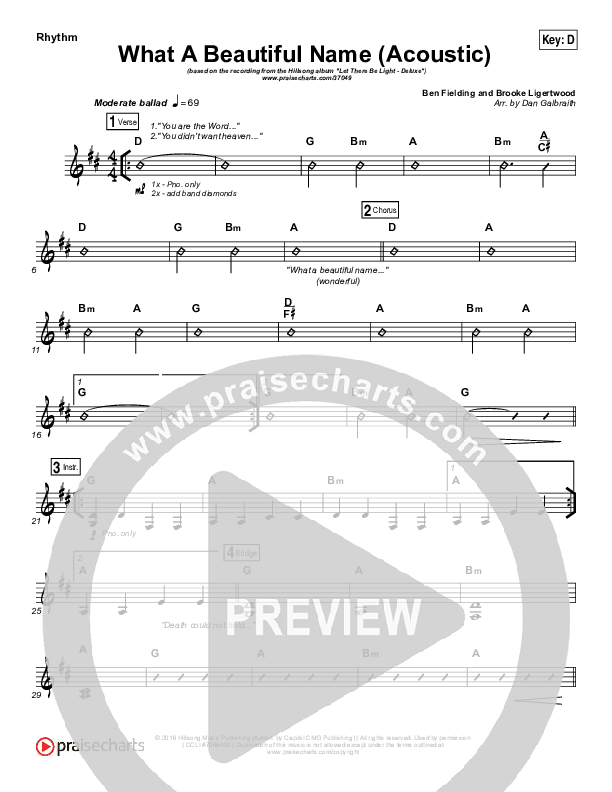 Download the Rhythm Chart for What A Beautiful Name (Acoustic) by Hillsong Worship, from the album Let There Be Light. This song was arranged by Daniel Galbraith in the key of D, E, Eb.