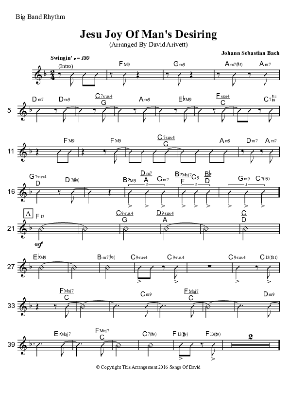 Download the Rhythm Chart for Jesu Joy Of Man's Desiring (Instrumental) by David Arivett, from the album Jazzed In Church.