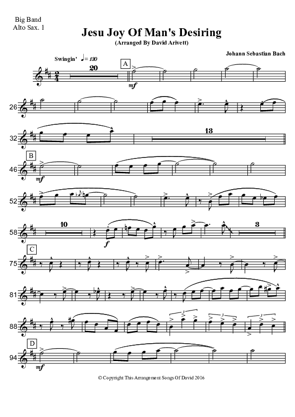Download the Alto Sax 1,2 sheet music for Jesu Joy Of Man's Desiring (Instrumental) by David Arivett, from the album Jazzed In Church.